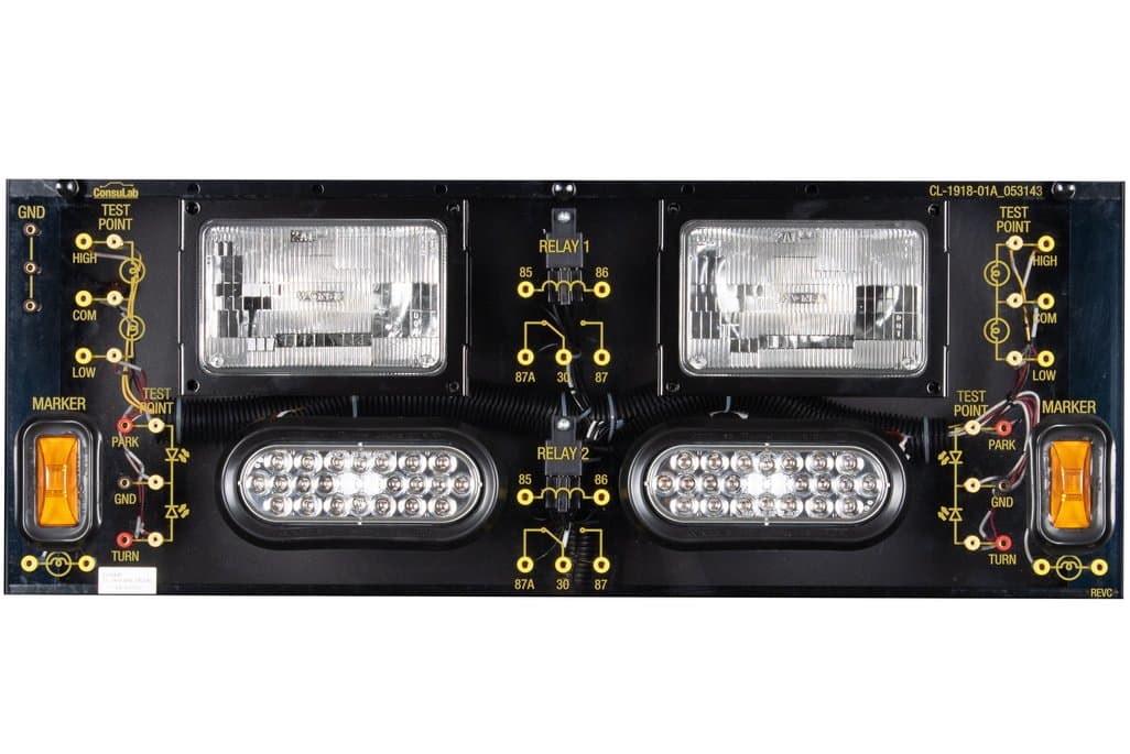 The ConsuLab CL-1918-3D Double-sided Automotive Lighting System Trainer utilizes the “Moduponent®” design feature which allows unlimited expansion capabilities. A Moduponent® consists of a clear Plexiglas sheet with components, wiring and socket test points attached. The Moduponent® is attached to the trainers using disconnect fasteners which allows easy adaptation and configuration for different applications.