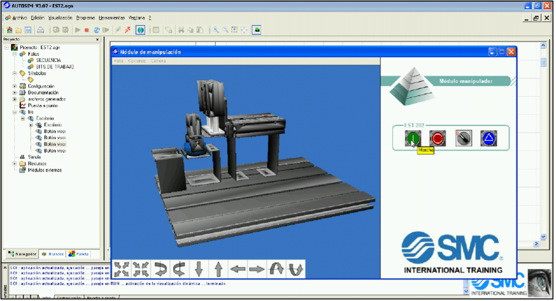 The operation carried out by the third station consists of picking the piece from the initial position (feed position) and placing it on the final position, for this a cartesian manipulator with gripper is used. The piece-manipulation operation requires that there is a piece in the initial position, previously positioned by the user. This operation begins when the start pushbutton of the control and simulation application is pressed.